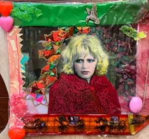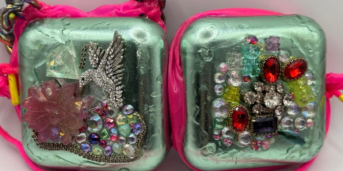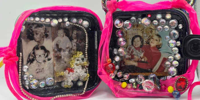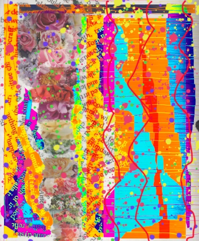 black & white photo, acrylic markers,acrylic paint, resin jewels, costume jewelry, epoxy resin, Clinique makeup; tabloid size